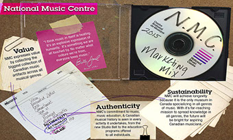 The Bridge- Research and branding project. Brand presentation for proposed music museum based off of the National Music Center in Calgary. Board, CD, CD card, and CD tray were laid out and photographed, along with vinyl records, drumsticks, 3D glasses. 2015.