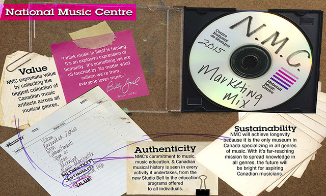 The Bridge- Research and branding project. Brand presentation for proposed music museum based off of the National Music Center in Calgary. Board, CD, CD card, and CD tray were laid out and photographed, along with vinyl records, drumsticks, 3D glasses. 2015.